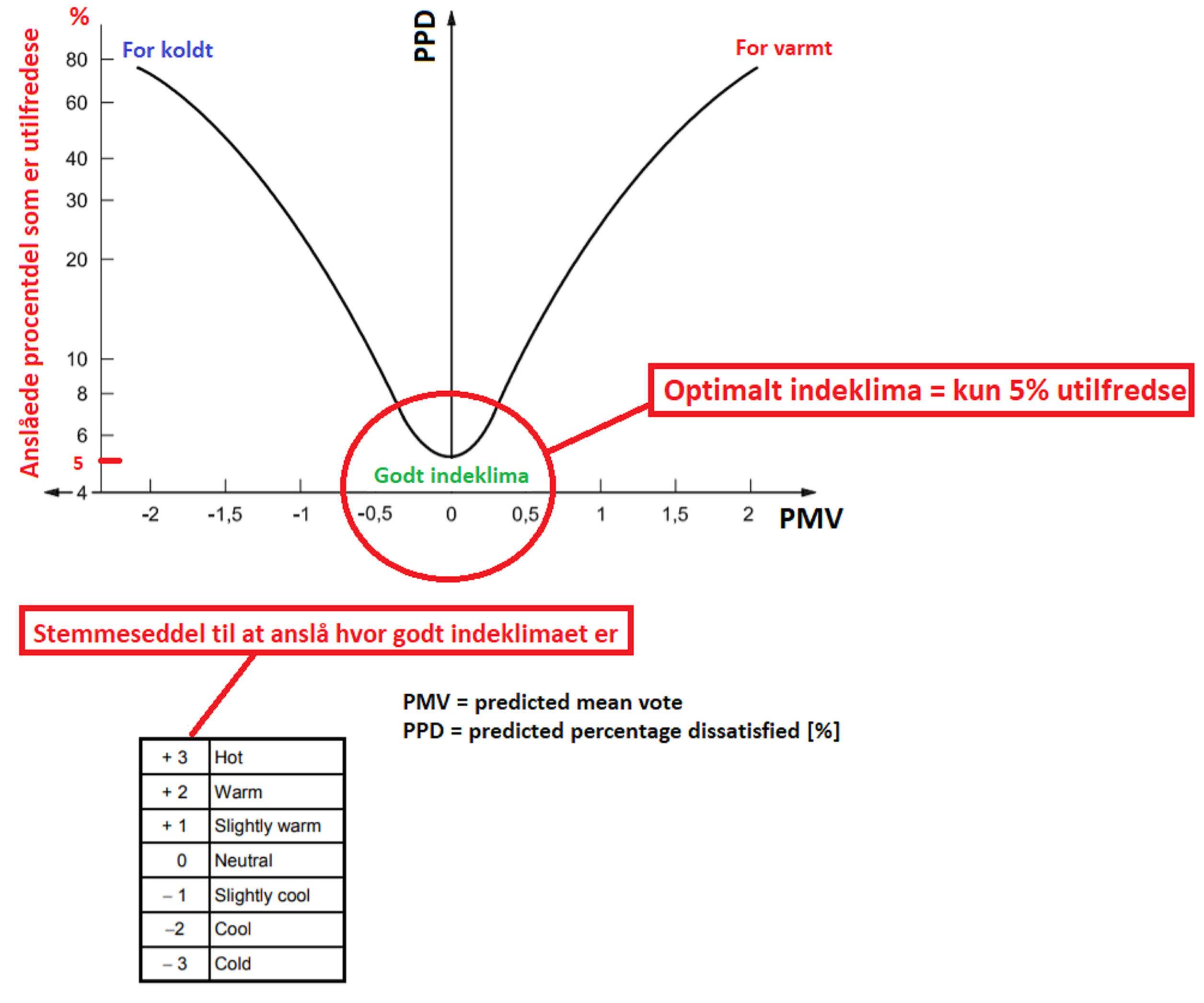 PMV- og PPD-indekset er lavet for at vise hvor mange personer der vil være utilfredse med indeklimaet i et lokale, i indekset nedenunder kan det ses at der minimum vil være 5% utilfredse, selv når man har gjort alt hvad man kan for at dårlig luft og for høje eller lave temperaturer. ved 10% utilfredse vil man betegne indeklimaet som ok.